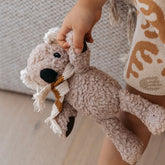 Humphrey Koala is made from beautifully soft 100% cotton plush in a warm caramel shade, with contrasting chocolate corduroy hands and feet. He wears a cosy Australian merino wool scarf, knitted in classic mustard and cream stripes, perfect fun adventures.
